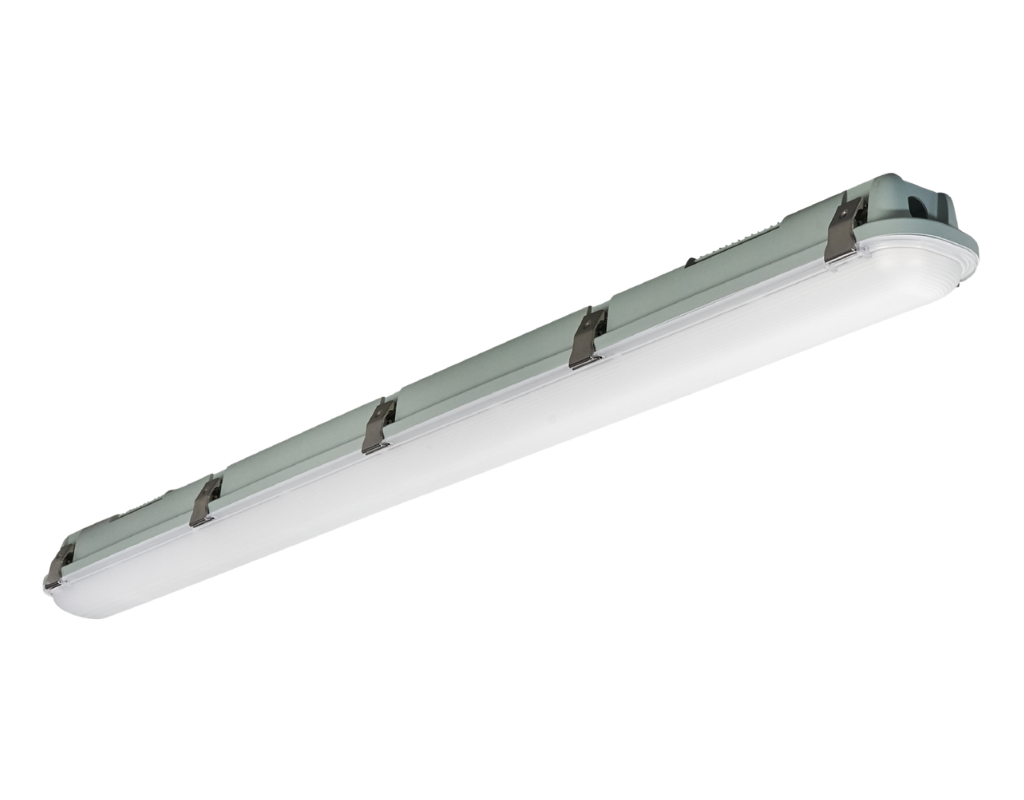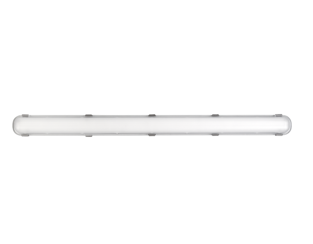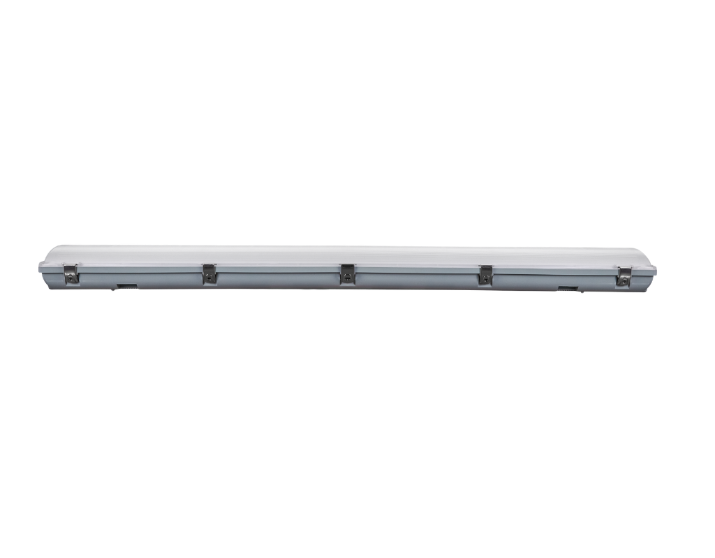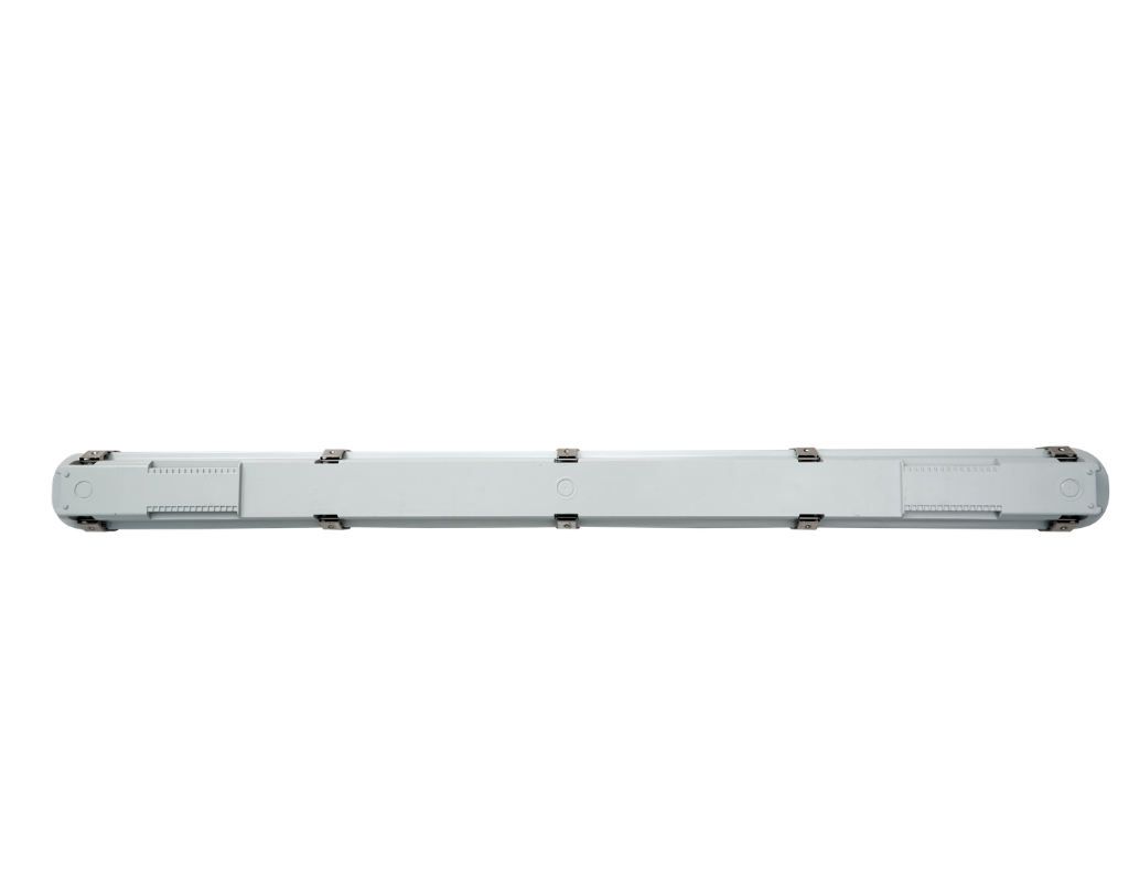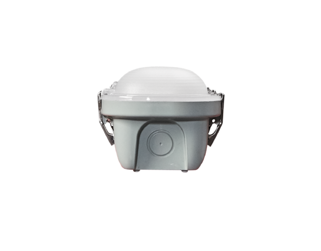 The fixture is made up of a durable light gray 5VA polycarbonate housing with stainless steel latches. For structural strength and long-term reliability, it is equipped with a high-quality frosted polycarbonate (PC) optical lens.